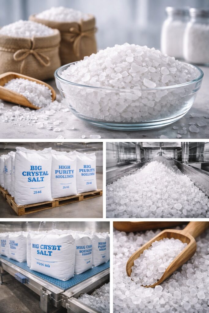 Big crystal salt is widely used in industries where bulk salt is required for processing, purification, and chemical manufacturing.